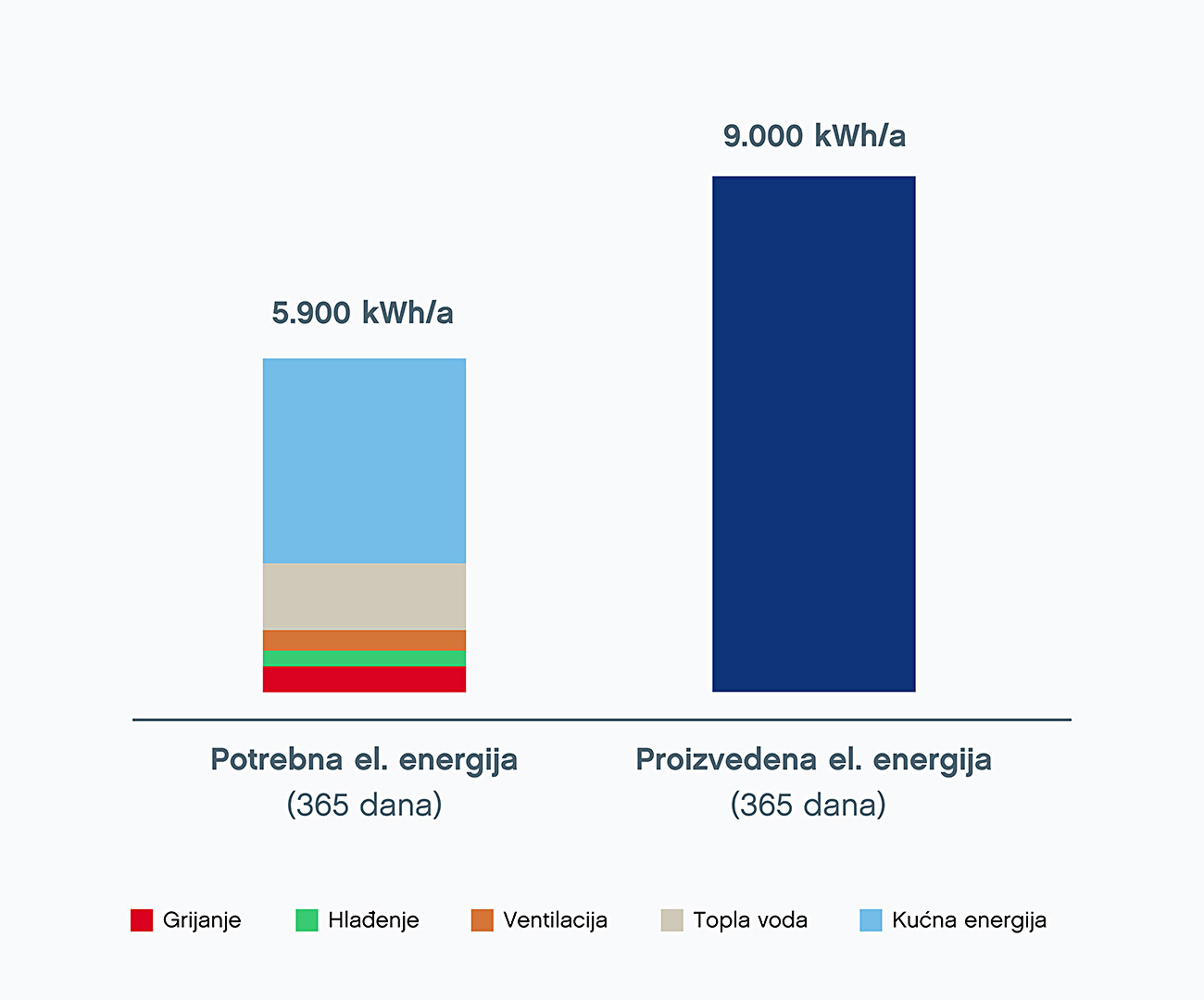 Uzimajući u obzir suvremena tehnološka rješenja i mogućnosti korištenja obnovljivih izvora energije, na nadstrešnici za automobile ugradili smo solarnu elektranu koja proizvodi dovoljno električne energije za funkcioniranje kuće, dok se višak koristi za električnu mobilnost, omogućujući oko 15.000 km godišnje vožnje električnim automobilom.